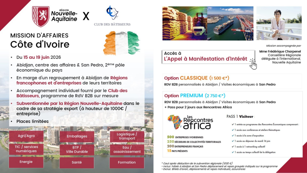 A l’occasion du regroupement annuel de l’Association Internationale des Régions Francophones en juin à Abidjan, la Région Nouvelle-Aquitaine et le Club des Bâtisseurs organisent une mission économique en Côte d’Ivoire du 15 au 19 juin 2026, menée par Frédérique Charpenel, conseillère régionale de Nouvelle-Aquitaine déléguée à l’International.