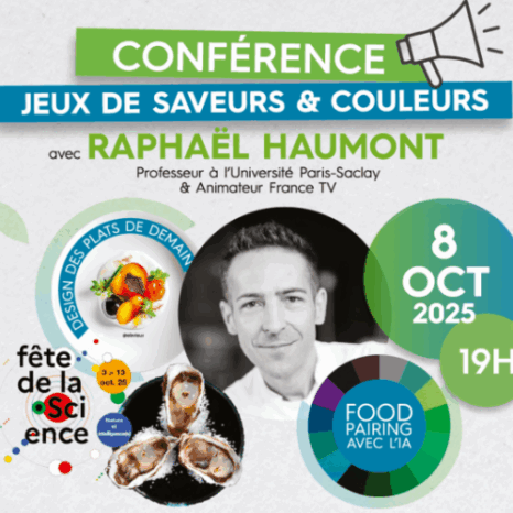 Cette conférence, animée par Raphael Haumont, professeur à l’Université Paris Saclay, Animateur France TV, et Expert en physico-chimie des matériaux vous fera découvrir de manière ludique comment le foodpairing, l’IA et le design culinaire révolutionnent la création des plats de demain. Une expérience unique pour explorer science et gastronomie, accessible à tous !