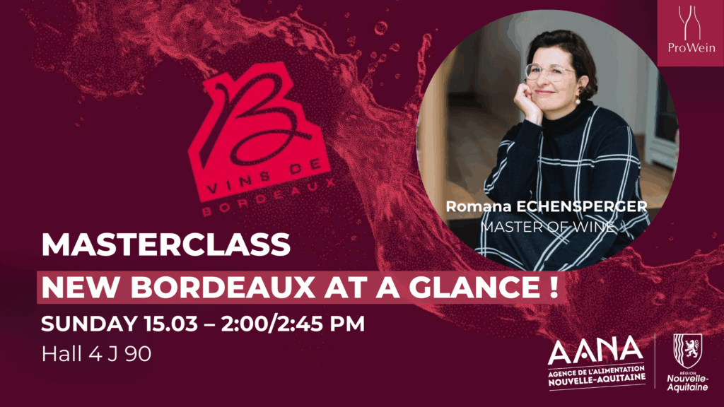 AANA is hosting one masterclass at Prowein Dusseldorf 2026, showcasing Bordeaux wines and animated by Romana Echensperger, Master of Wine, wine critic, journalist, and independent consultant, member of the renowned German women’s wine professional club, Vinissima, and a specialist in organic and biodynamic wines :